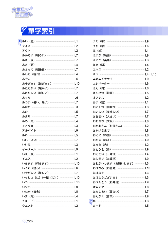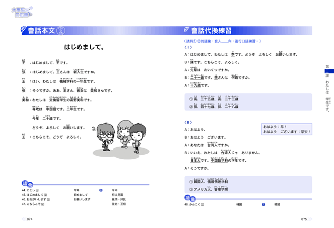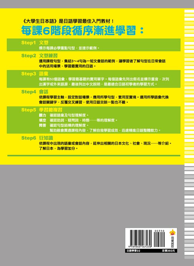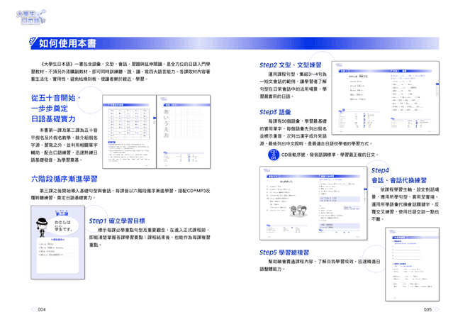 《大學生日本語》是日語學習最佳入門教材,每課6階段循序漸進學習: