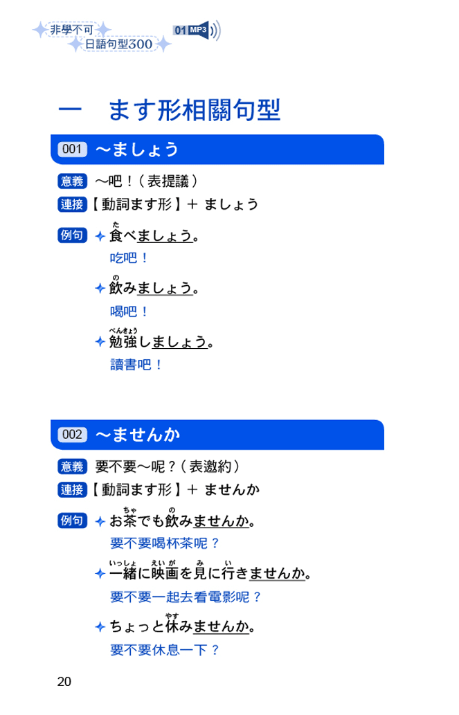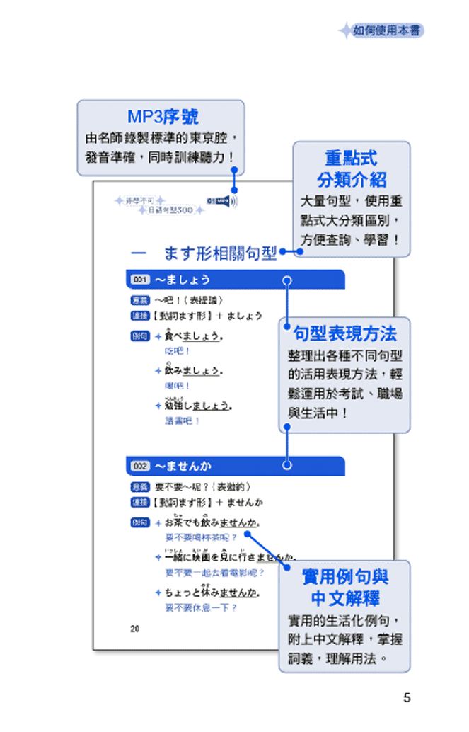 全書上千例句,特地聘請日本名師錄製成MP3,不僅加強文法句型練習,還可以增強聽力,讓您