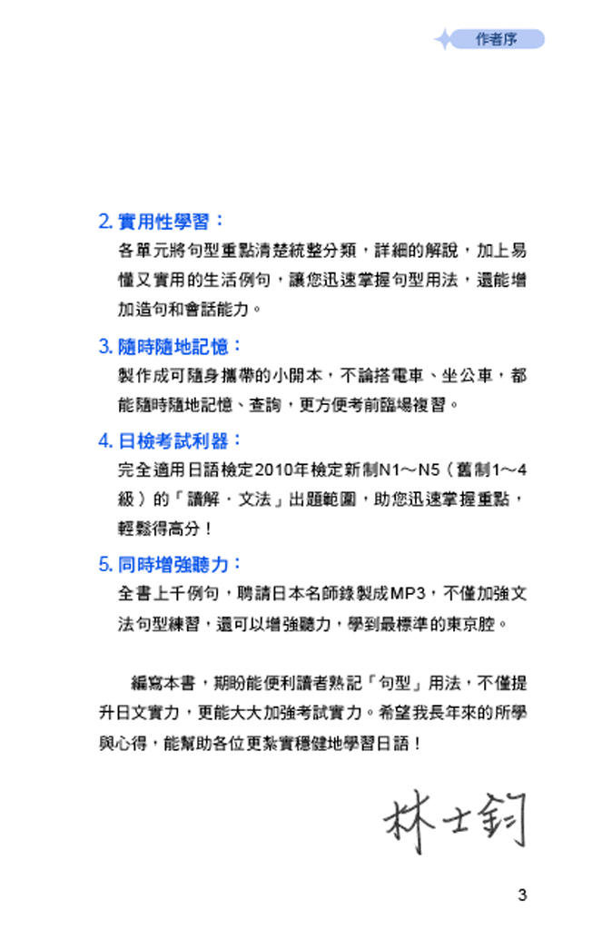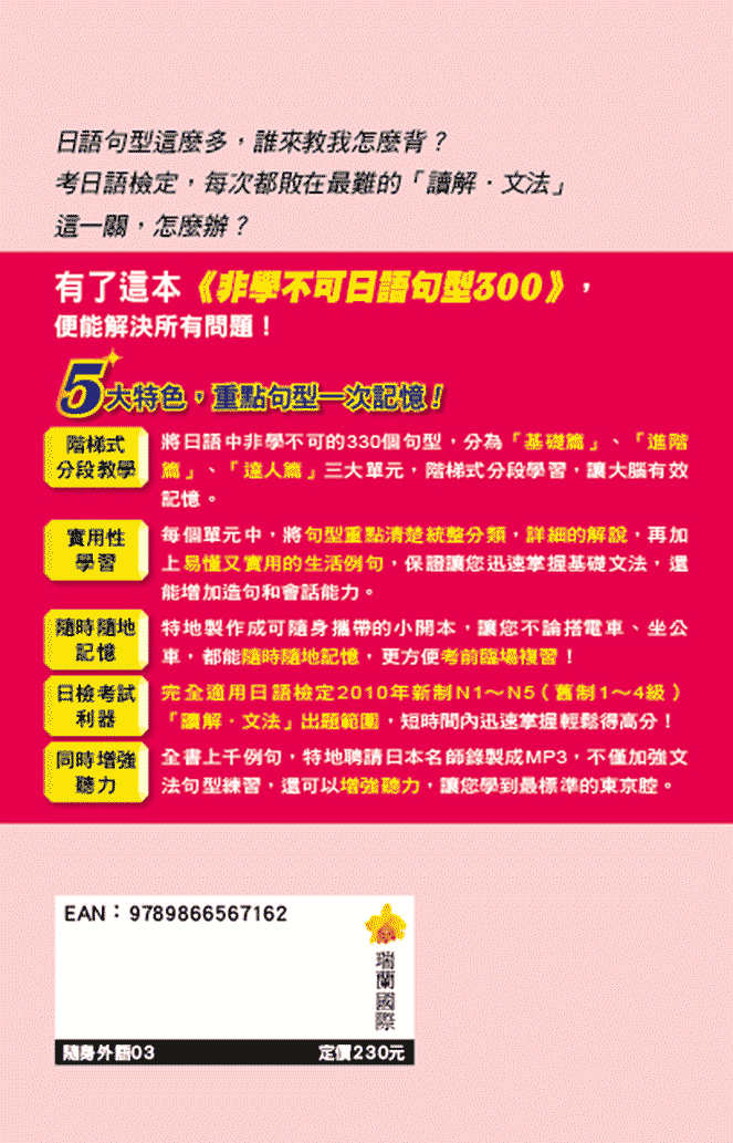 每個單元中,將句型重點以不同詞性分類,清楚的解說,再加上易懂又實用的生活例句,保證讓