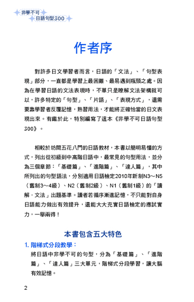 「進階篇」的171個句型分為「一、接尾語.複合語;二、副助詞;三、複合助詞;四、接續用法;五、句尾用法;六、形式名詞」六大類。讀者只要依序讀下去,相信一定可以在最短的時間內記住相關句型,讓實力更上一層樓。