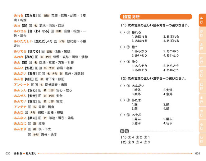 大量單字依五十音排序,符合日語閱讀使用習慣;索引標籤清楚標示每頁字彙內容,查詢最迅