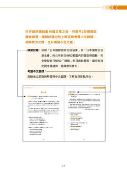 1.閱讀面向最廣:文章包含「社會教育」、「環境」、「運動」、「傳統藝能文化」、「娛樂」、「旅行」……等8大主題,一網打盡新日檢「讀解」科目必考題材,建構日語文章邏輯觀念。