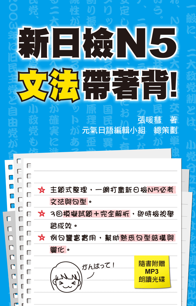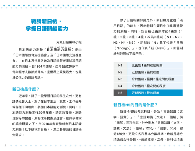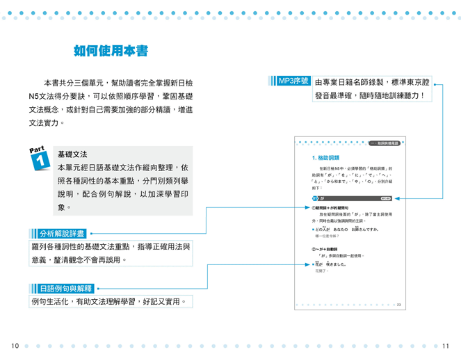 完全收錄新日檢N5程度文法規則,歸納深入淺出,迅速建立基礎日語概念。