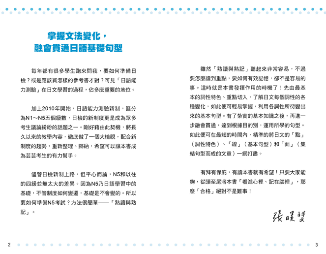 加上2010年開始,日語能力測驗新制,區分為N1~N5五個級數,日檢的新制度更是成為眾多考生議論紛紛的話題之一。剛好藉由此契機,將長久以來的教學內容,徹底做了一個大檢視,配合新制度的趨勢,重新整理、歸納,希望可以讓本書成為芸芸考生的有力幫手。