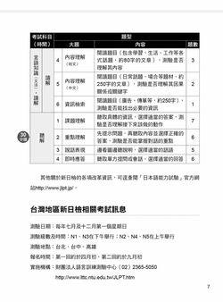 全書包含「6回文字‧語彙測驗題 / 解析」 + 「1回全真模擬試題」 + 「7天必背重要單字」,所有內容完全依據「日本國際教育支援協會」與「日本國際交流基金會」公佈之範圍出題,由長期教授日文、研究日語檢定的作者群執筆編寫,幫助你了解弱點,及時補強。「學習」、「演練」雙管齊下,立即提升實力。