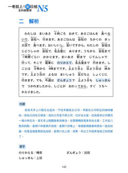 本單元老師先以一短篇日語文章做解析,並附中文翻譯,還標示了精進閱讀能力不可或缺的材料──重點單字及句型。只要搭配第一單元學習到的文字語彙,以及第二單元學習到的句型文法,再運用本單元老師教導的讀解要領,那麼因應N5讀解,可說是輕而易舉。