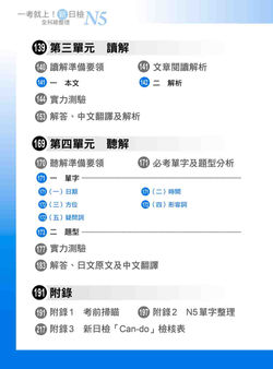 ● 本書包含四大單元,完整掌握新日檢N5考試科目與範圍!