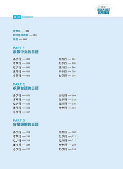 本書分成三個單元,第一單元:選出「接近中文發音的日語」,第二單元:選出「接近台語發音的日語」,第三單元:選出「容易誤解的日語」。第一單元和第二單元,擁有學習優勢的我們,可以藉此輕鬆學會日語。而第三單元特別選出易招致誤解的日語單字,例如:「色(いろ)男(おとこ)」(帥哥)。這些單字雖然同是漢字,但是真正的意思和日語相差很大,為了避免混淆誤用鬧笑話,也為了讓讀者感受中日語言的差異,所以特別藉此單元,幫讀者解開令人跌破眼鏡的中文意思。