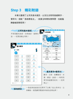 從基本的打招呼常用句開始,接著銀行篇、餐廳篇、飯店旅館篇、超市篇、醫院篇、美髮沙龍篇、旅行篇、社交活動篇、興趣嗜好篇……等21個生活實用場景,在實際應用中練習土耳其語會話。