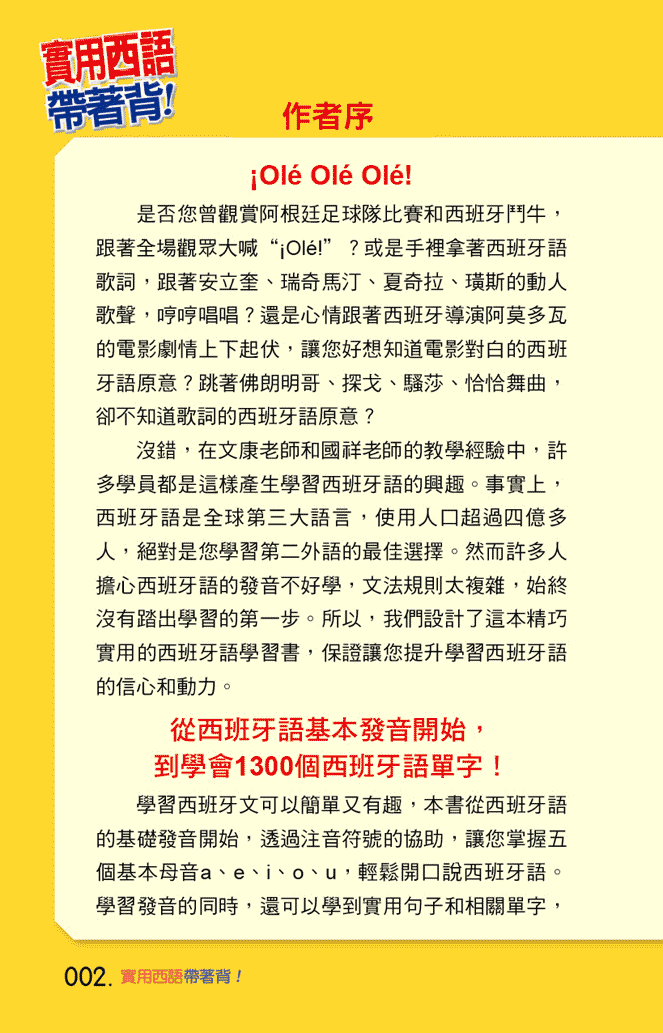 沒錯,在文康老師和國祥老師的教學經驗中,許多學員都是這樣產生學習西班牙語的興趣。事實上,西班牙語是全球第三大語言,使用人口超過四億多人,絕對是您學習第二外語的最佳選擇。然而許多人擔心西班牙語的發音不好學,文法規則太複雜,始終沒有踏出學習的第一步。所以,我們設計了這本精巧實用的西班牙語學習書,保證讓您提升學習西班牙語的信心和動力。