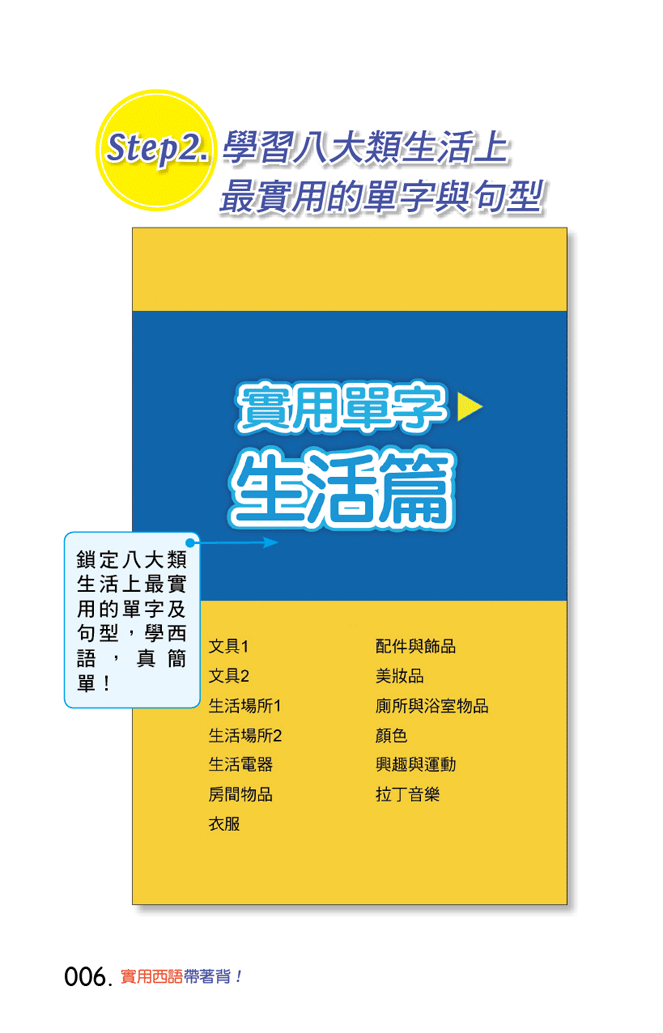 接著,文康老師和國祥老師整理出21句西班牙語基本句型,及超過1300個基本單字,包含西班牙和拉丁美洲不同的詞彙用語,安排成「身分篇」、「身體篇」、「生活篇」、「自然篇」、「旅遊篇」、「飲食篇」、「時間篇」、「數字篇」等八大類單字,便於查詢和使用。這些都是西班牙語學習者詢問度最高的單字和句型,讓您一書在手,簡單說出實用的西班牙語。