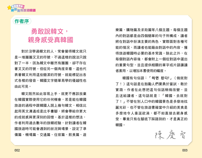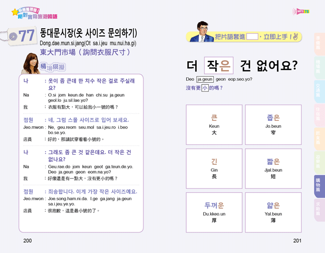 製作成可隨身攜帶的小開本,讓您不論走到天涯海角,都能隨時查詢、運用、學習韓語,自助旅行輕鬆又方便!