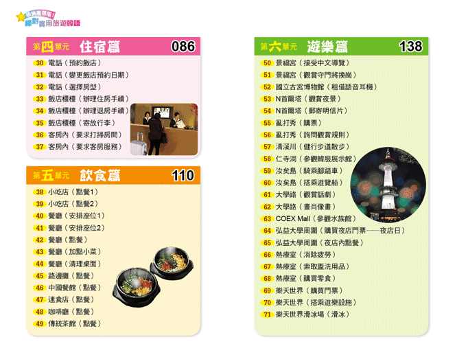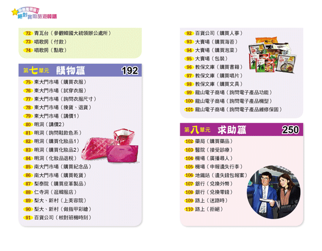 「準備篇」、「機場篇」、「交通篇」、「住宿篇」、「飲食篇」、「遊樂篇」、「購物篇」、「求助篇」,精心選出最實用好記的單字與會話,讓您一書在手,暢遊韓國!