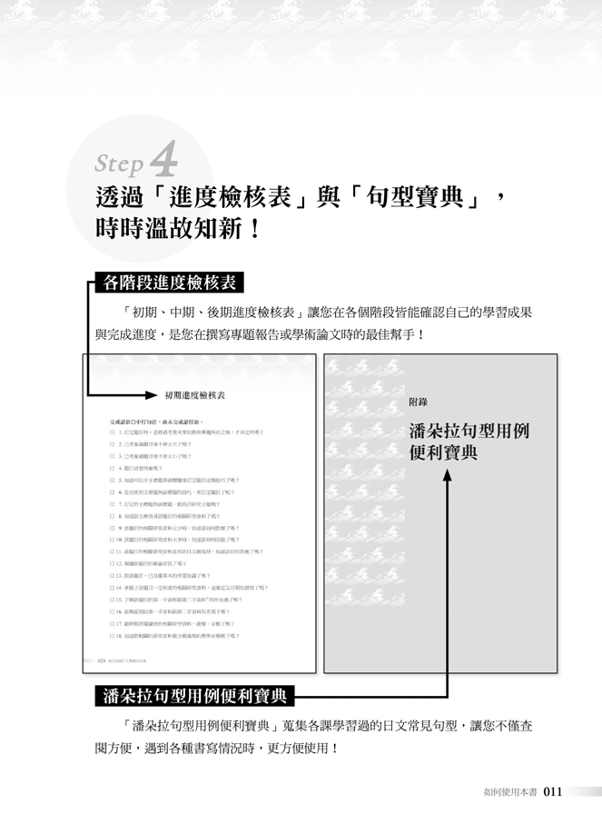 撰寫專題報告或學術論文時,常會用到許多固定的日文句型,像是表達贊成意見的句型「~~~~の論説は~~~~傾聴すべきである」,或是說明製作圖表用意的句型「~~は図1(表1)に纒めることができる」等等,這些好用、慣用的日文常見句型全部蒐集於附錄中,讓您不僅查詢方便,更能靈活運用於專題報告或學術論文中!