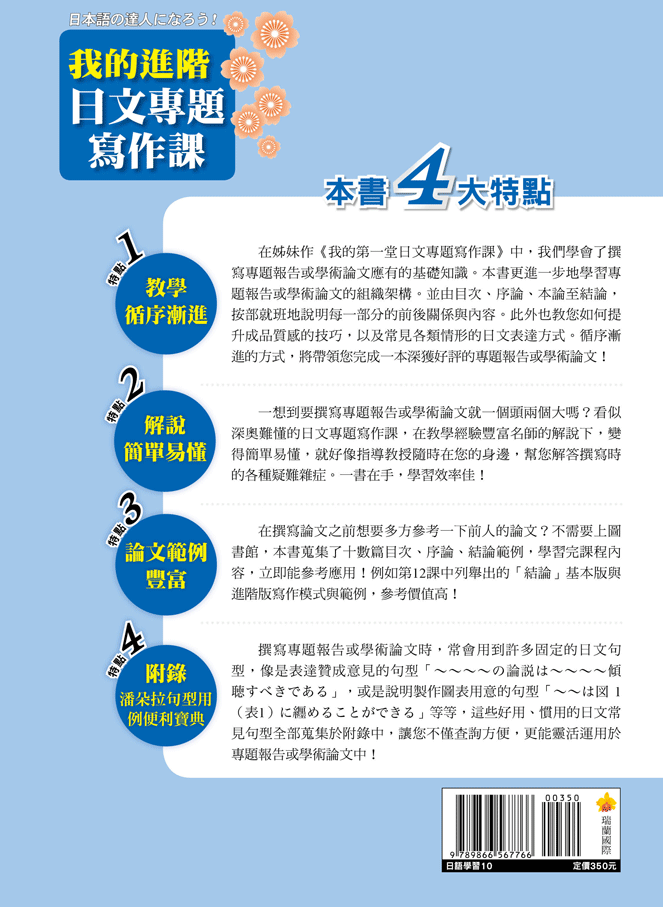 繼去年2010年9月秋桂老師與落合老師合著出版了《我的第一堂日文專題寫作課》一書之後,在忙碌的教學與研究之餘,於今年9月又推出了續篇《我的進階日文專題寫作課》。此書是針對大學四年級的《研究方法論》、以及研究所的《論文指導》所設計出的主題,總共13 課,其內容包括認識專題報告或學術論文的組織架構、編排目次、專題報告或學術論文特質、「序論」的寫法、「本論」的寫法、日文表達方式、提升論文成品質感的技巧(如何嵌入非文字之影像、圖表資料)、如何彙整龐雜資料、推論方式、意見表達、「結論」的寫法、及整體論文的校對重點等十三篇。