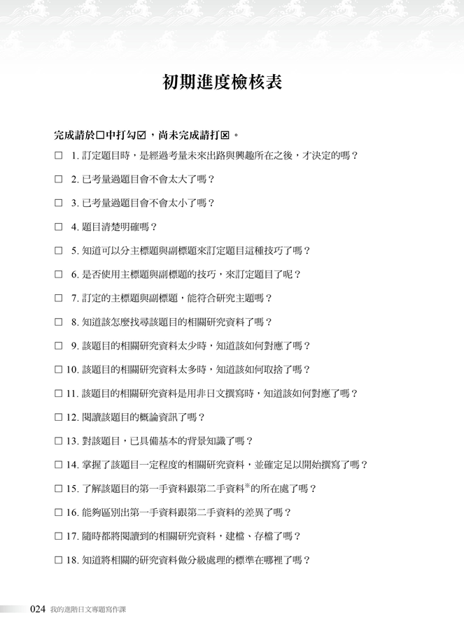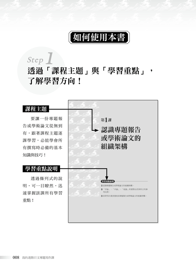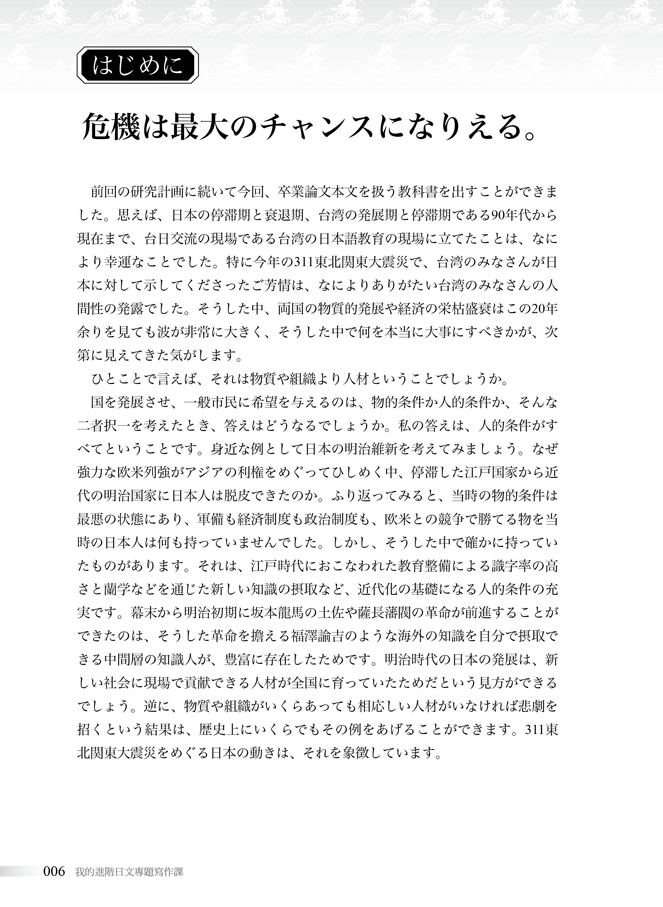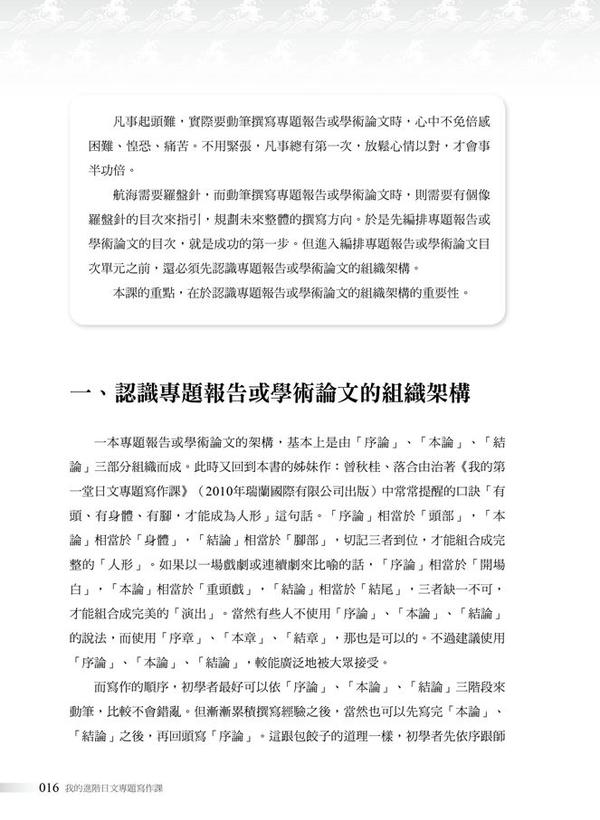 學生能力的進步,對老師而言,無疑是最大的肯定。兩位老師因此更加認真思索如何讓學生們突破限制、邁向專精,第二本日文專題寫作的「聖經」就此問世。如同書名之標示,從「第一堂課」到「進階」,內容與範圍的深廣度都到達另一個更高的階段,兩位老師對學生的砥礪、琢磨、拳拳愛護之心,躍然於字裡行間。