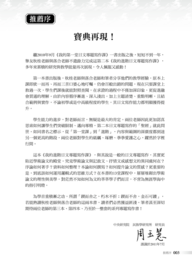 繼2010年9月《我的第一堂日文專題寫作課》一書出版之後,短短不到一年,摯友秋桂老師與落合老師不遺餘力完成這第二本《我的進階日文專題寫作課》,多年來累積的研究與教學能量再次展現,令人佩服又感動!