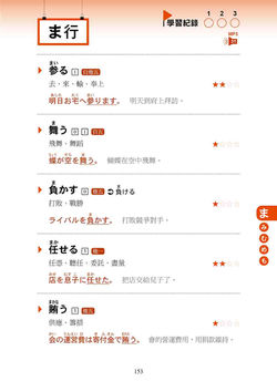 每個動詞均依重要程度標記,星星愈多愈常用,趕快背起來吧!每頁還有進度標記,方便您記錄學習情況,一點一滴累積日語實力!