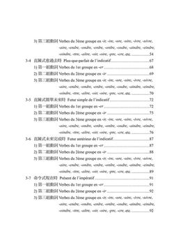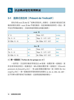 利用第一組動詞字尾「-er」(aller除外)、第二組動詞字尾「-ir」及現在分詞字尾「-issant」、第三組不規則動詞,在說話語氣及時態上做詳盡的規則說明,並有「小提醒」作為學習祕訣,讓學習者對動詞變化規則一目了然。